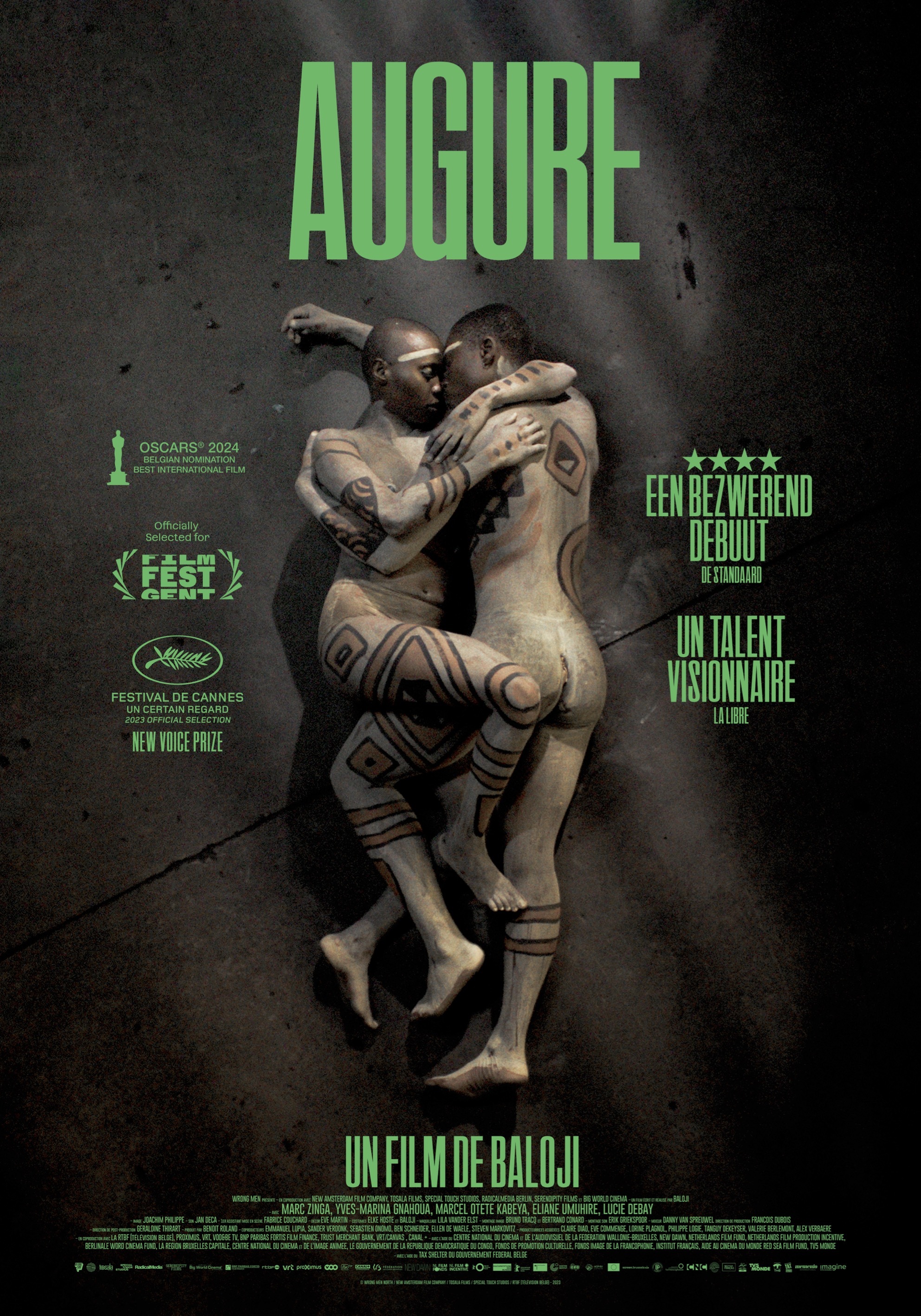 Augure est le premier long métrage de Baloji, un rappeur et performeur belgo-congolais. Il a écrit la première version de son film en 2018, après la mort de son père. Les pleureuses professionnelles engagées par sa famille ont inspiré Baloji pour ce premier film solide comme un roc, avec une approche magico-réaliste. Le film a déjà été primé à Cannes, a reçu des critiques très favorables et a été choisi pour représenter la Belgique aux Oscars. Augure a remporté l'Ensor de la Promesse de l'année et l'Ensor du meilleur film belge francophone. Augure a également remporté 5 prix lors de la cérémonie des Magritte du cinéma.