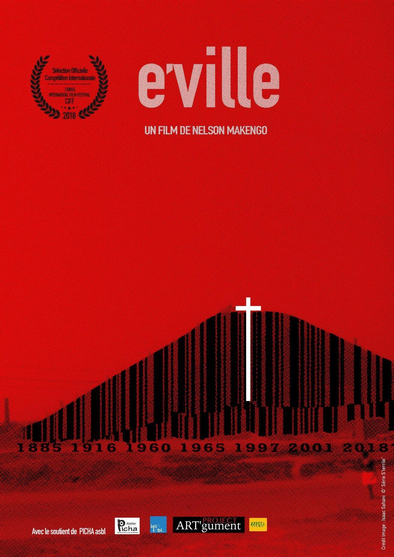 E’ville, raccourci pour Élisabethville, nom donné à la ville de Lubumbashi avant 1960. Un film en strates, qui superpose ambiances musicales, archives sonores, images et fantômes, une visite d’un cercle sportif abandonné de la Gécamines (Société générale des carrières et des mines). Une juxtaposition des images d’un lieu vide au poids de l’Histoire, à travers un récit intime en off : une lettre ouverte de Lumumba à sa femme. La désolation du lieu se déploie sous l’impulsion des voix et des corps qui le traversent. Mêlant l’intimité familiale à l’Histoire, le film nous plonge dans la mémoire collective du pays.